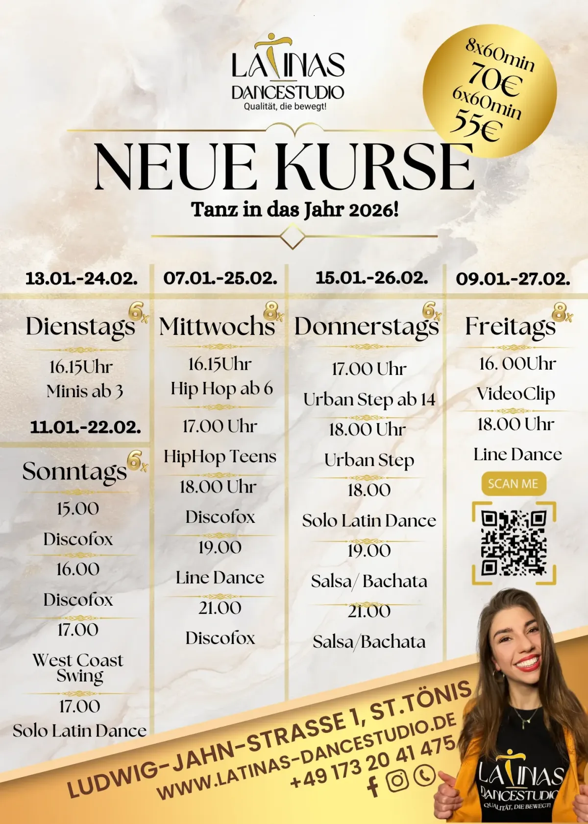 Du kannst grundsätzlich jederzeit bei uns einsteigen. Im Bereich Solo Latin Dance empfehlen wir jedoch, zu Monatsbeginn einzusteigen, da zu diesem Zeitpunkt immer eine neue aufregende Choreographie beginnt. Bitte beachte, dass während der Ferienzeiten spezielle Ferienprogramme angeboten werden können. Du kannst dich gerne an uns wenden, um weitere Informationen zu erhalten. Im Gymdance hingegen ist der Einstieg jederzeit möglich und nicht an einen bestimmten Monat gebunden. Wir freuen uns darauf, dich in unseren Kursen begrüßen zu dürfen, wann immer es für dich am besten passt!
